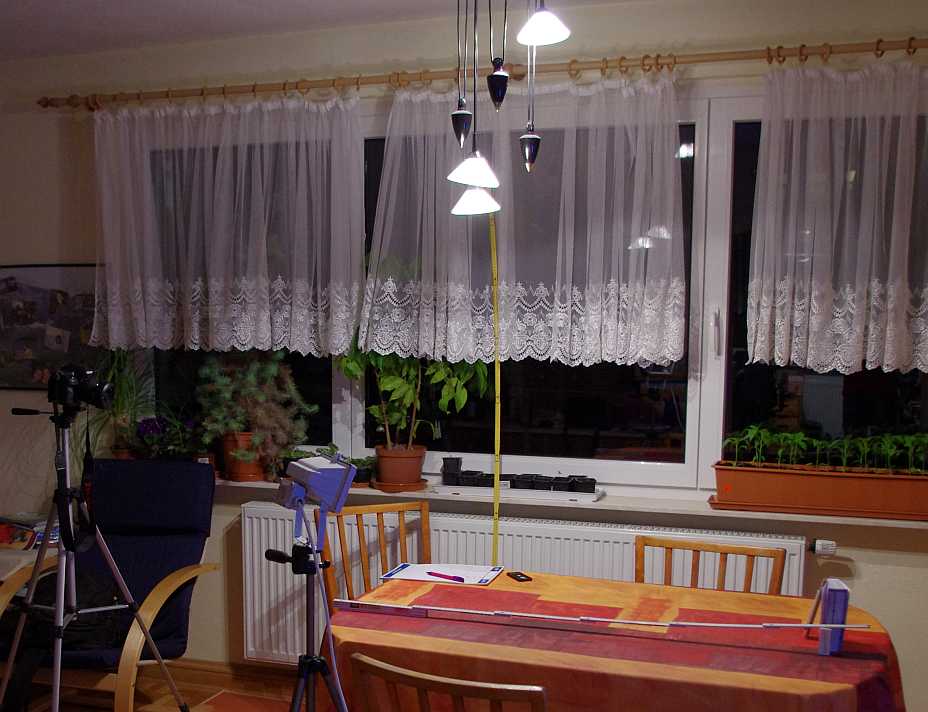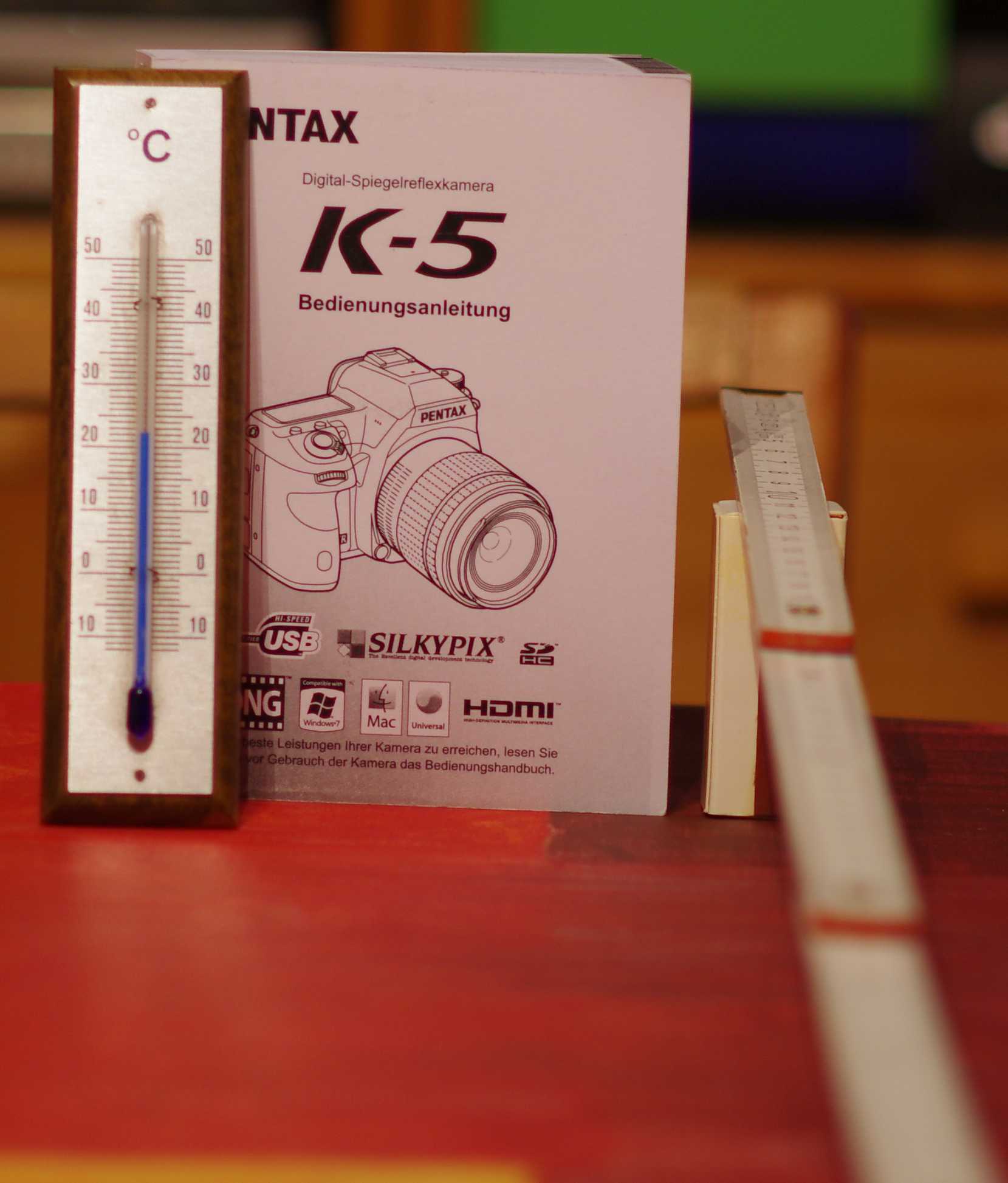 Ich verwende folgenden Testaufbau: Auf dem Tisch steht das Pentax-Handbuch. Focusiert wird auf die untere Hälfte, in etwa auf dem Silkypix-Schriftzug. Die Kamera ist auf einem Stativ, ISO200, ausgelöst mit Infrarot-Fernauslöser und 3s Spiegelvorauslösung. Beleuchtet wird sie Szene durch 3 35W Halogenlampen über dem Tisch. Alternativ kann durch einen 100W Baustrahler die Sache etwas aufgehellt werden. Der weiße Zollstock dient der Beurteilung der Focuslage und ist so ausgerichtet, dass die 10cm Marke mit dem Handbuch abschließt. Das Thermometer ist Schmuck und dient nur der besseren Beurteilung des Schärfeeindrucks.